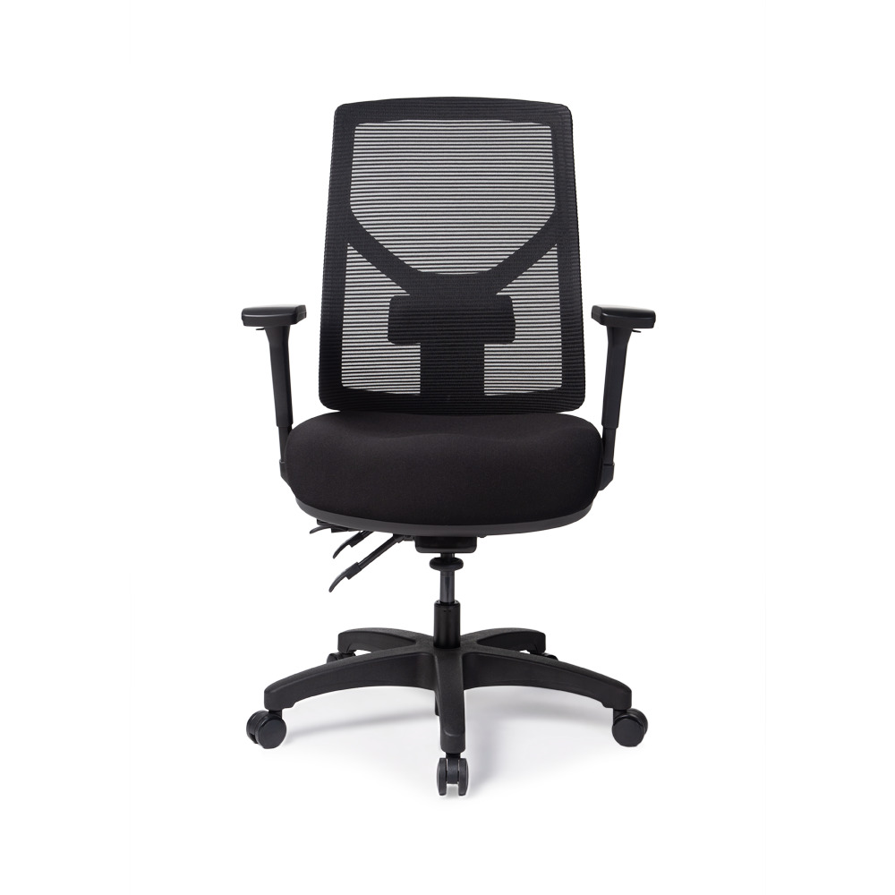 Sillón ejecutivo respaldo alto en malla con soporte lumbar y asiento en tapiz a elegir.